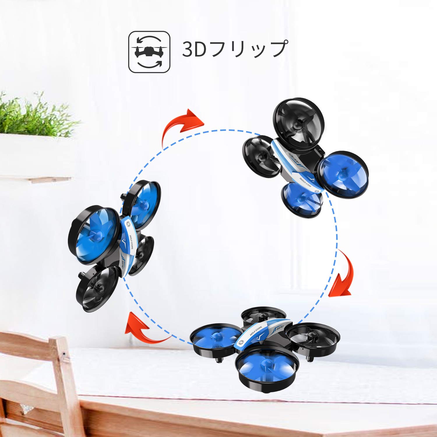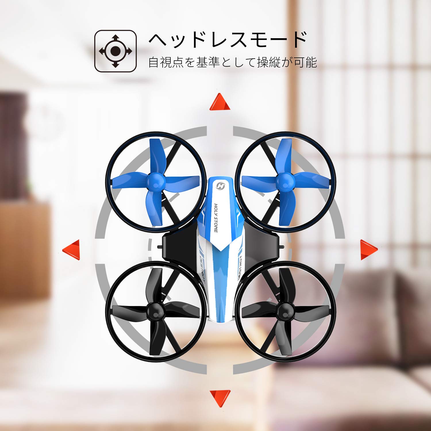 ヘッドレスモード 機体がどこを向いていても、操縦者から見た方向に機体が動きます。自視点を基準とした操縦が可能となるので、感覚的に操縦を楽しむことができます。