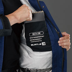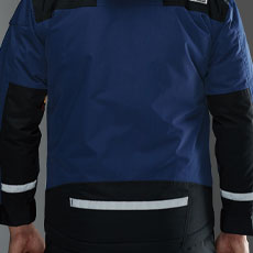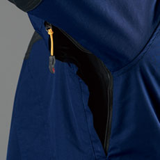 イージスの再帰性反射プリントを搭載した、光源に対して反射し、安全性重視の防寒防水ジャケット。こちらも同様の耐水圧10000mm 透湿度5000g/m2/24hの性能です。